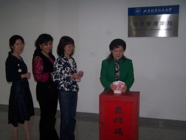 在四川汶川发生7.8级地震灾情后,我校召开会议,对有关抗震救灾献爱心工作做出全面部署,号召全校师生员工向灾区捐款,奉献爱心。根据学校部署,5月15日,经管学院分党委、行政办、工会联合组织了公益募捐活动,动员全院师生,号召大家关注灾情,参与救灾,奉献爱心,尽微薄之力,踊跃捐款,给灾难中的同胞带去重建家园的勇气和力量。