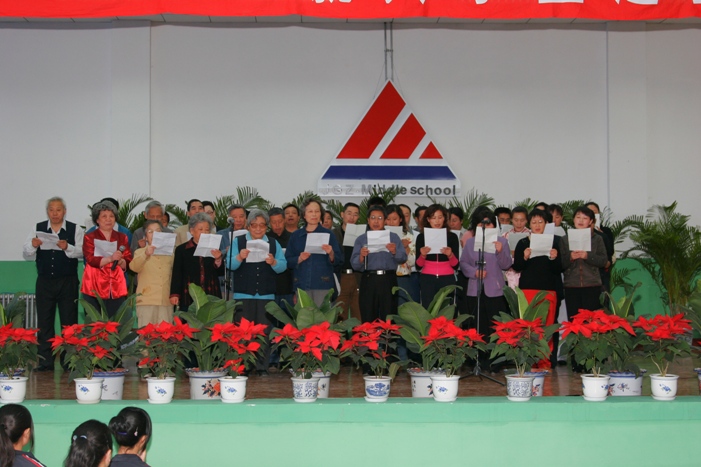 捐赠仪式过后是精彩不断的文艺演出。3608党支部的诗朗诵《理想》让我们对未来充满了期待;巨各庄中学同学们的手语表演《感恩的心》给了我们战胜困难的勇气和毅力;退休党支部的老教师和巨各庄中学的老师们合唱了革命歌曲《奉献一生的老一辈》,它是由退休支部邬宽明教授在《年青的朋友来相会》的乐曲上改词而成,又让我们目睹了这些为祖国教育事业默默耕耘了几十年的老教师们的风采。