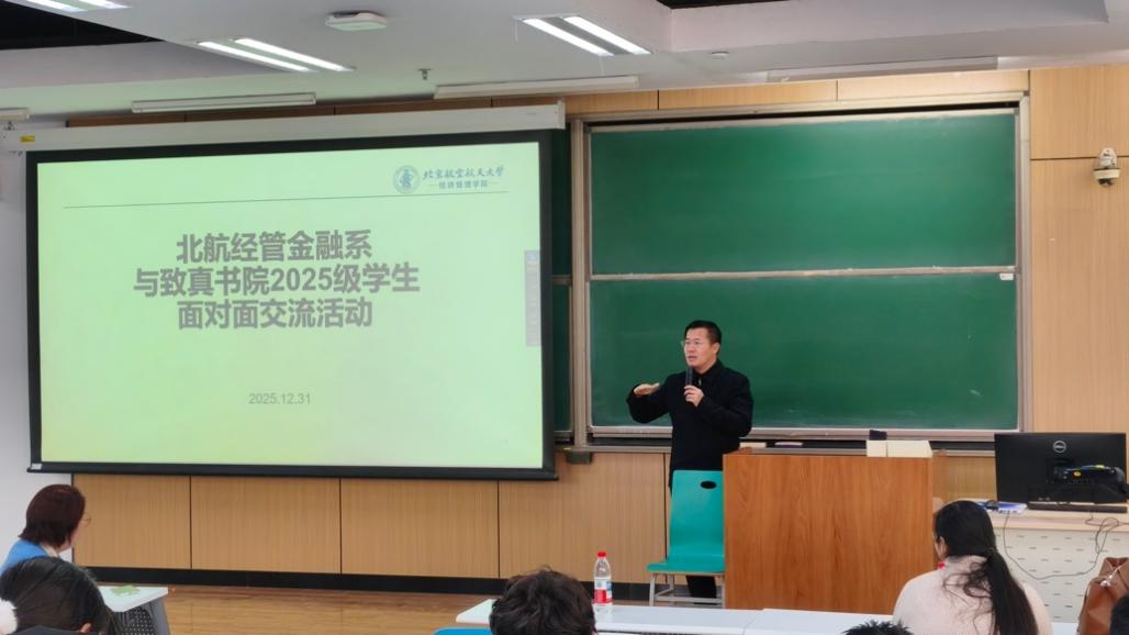 由北航经管金融系召集,由经管学院学生工作办公室和致真书院学生辅导员协助,“北航经管金融系师生与致真书院2025级学生面对面交流活动”于2025年12月31日(周三)下午14:00-15:30在北航沙河校区 J3-105 教室成功举办。本次活动金融系四位老师包括金融系主任部慧副教授、赵尚梅教授、谭小芬教授、大四学生班主任石丽娜博士,以及三位学生包括张婷(2021级保研留在北航金融专硕项目,院级优秀毕业论文)、王泽明(2021级保研留在北航金融专硕项目、能源经济大赛获得北京市二等奖获得者)、甘宇奇(2022级保研直博留在金融系博士生项目、冯如杯主赛道一等奖获得者)参加本次学生活动。