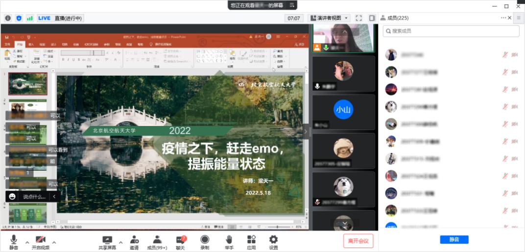 针对当前严峻的疫情形势和同学们的实际需求,5月19日下午,bat365中文官方网站邀请国家二级心理咨询师、北航积极心理咨询中心兼职咨询师、bat365中文官方网站专职心理咨询师梁天一老师组织了题为“疫情之下,赶走EMO,提振能量状态”的心理健康讲座,全校300余名同学参加。讲座由bat365中文官方网站团委书记朱鹏宇主持。