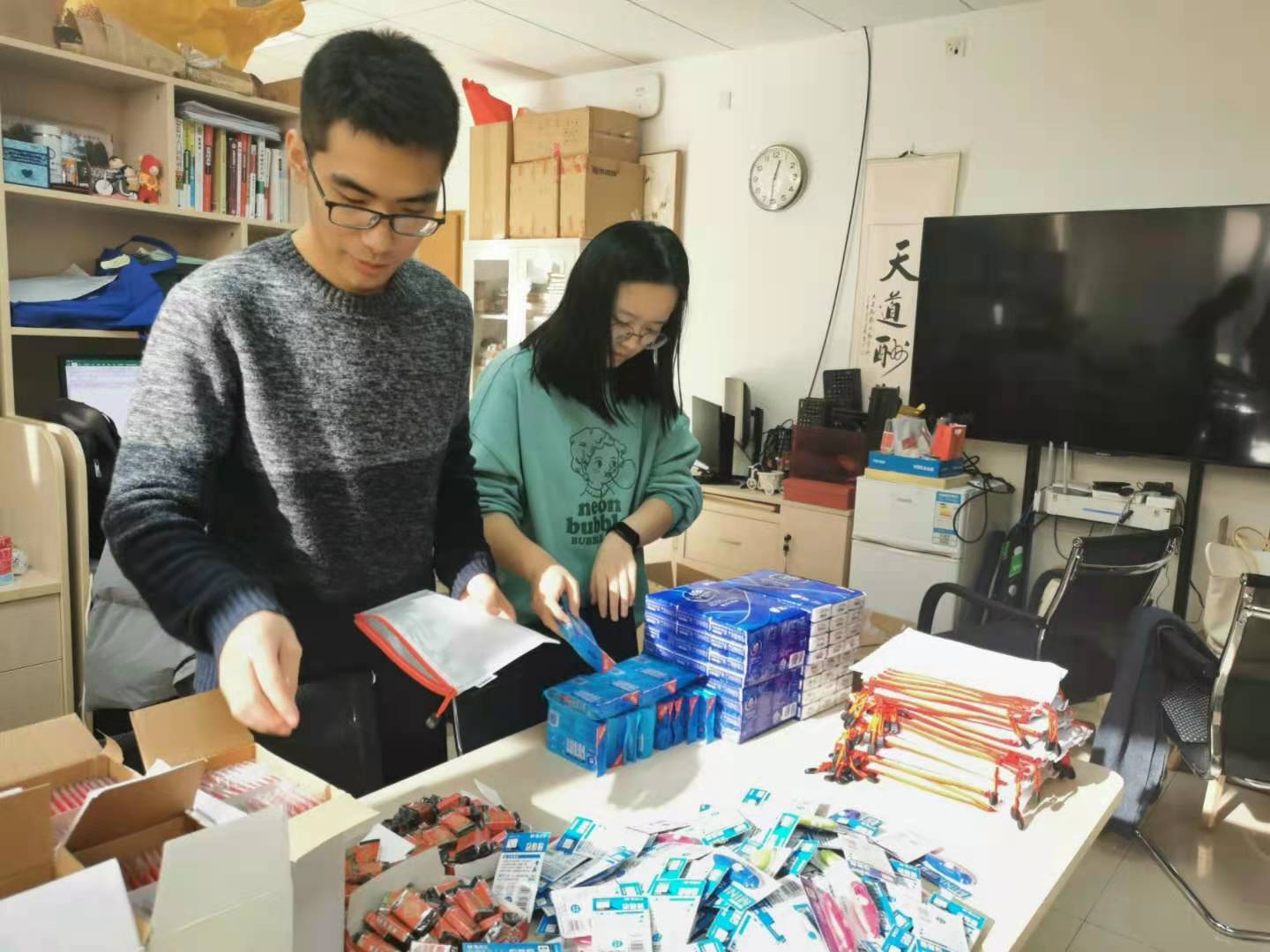 2020年12月24日,bat365中文官方网站党委副书记高超、分团委书记朱鹏宇、专职辅导员白雪、2017级兼职辅导员田莉娟、郭梁、2018级辅导员张园园共同为考研学生分装礼包、书写祝福语。一字一句的祝福,体现出学院对考研学子细致的关怀和殷切的期盼。
