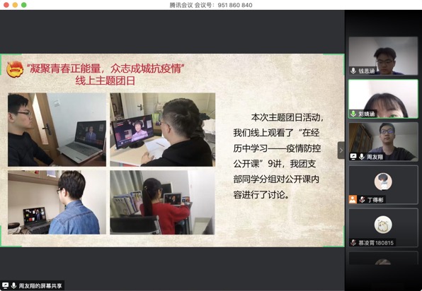 202052414:00,1808优秀团支部答辩在腾讯会议平台以线上会议形式举办。此次答辩由1808辅导员丁得彬主持,共有7个团支部参与答辩。答辩特别邀请了1808班班主任王楚男老师、李伟老师,研究生辅导员李达晨、王劲奇,本科生辅导员张园园、朱帅东以及1808团支部14名学生团员代表作为评委,为各个团支部的表现评分。