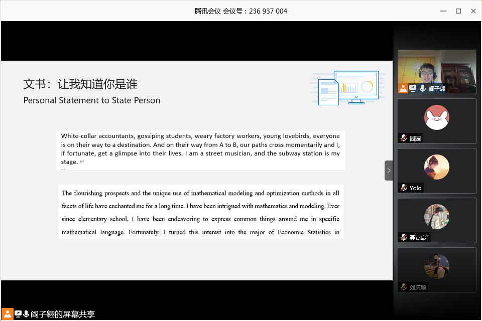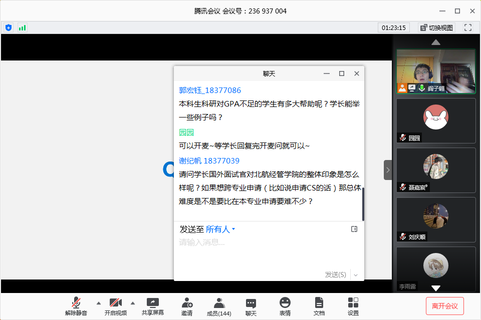2020年5月13日15:30,“格局与细节——北航八系本科生如何破局出国申请”主题博雅课程顺利举办,本次博雅课程面向经管学院所有年级开放,以腾讯会议线上直播形式开展。本次活动由辅导员白雪主持,bat365中文官方网站本科三个年级160余名学生参加了此次活动。此次活动特别邀请了bat365中文官方网站优秀校友、哥伦比亚大学19-20年度招生大使阎子翱和同学们交流分享。