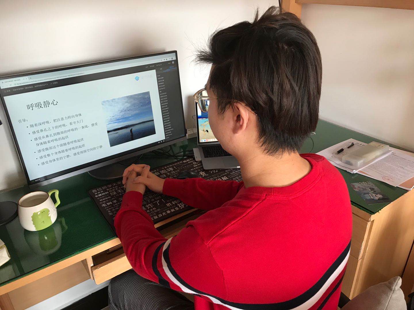 抱着平复开学综合症的心态参与了本次学习日,两个小时的学习中我而获得了深层次的收获。课程中的心理调整、音频播送可以让我忘记心中的烦乱;而课程中教授的面对挑战、面对情绪波动的方法论,是可以超出此时的困难和场景的限制,具有长期的作用效果。在听课过程中我也有自己的体会:以课程中的觉知体验为例,这种平复情绪的方法突出对自我的认知。我想这不仅可以在慌乱时正向平复心态,获得宁静与快乐;也许更可以在懒惰、犹豫这种情绪不剧烈但是影响个人精神的场景中反向恢复自我(坚定的)意识。刘老师为我打开一种全新的思路。