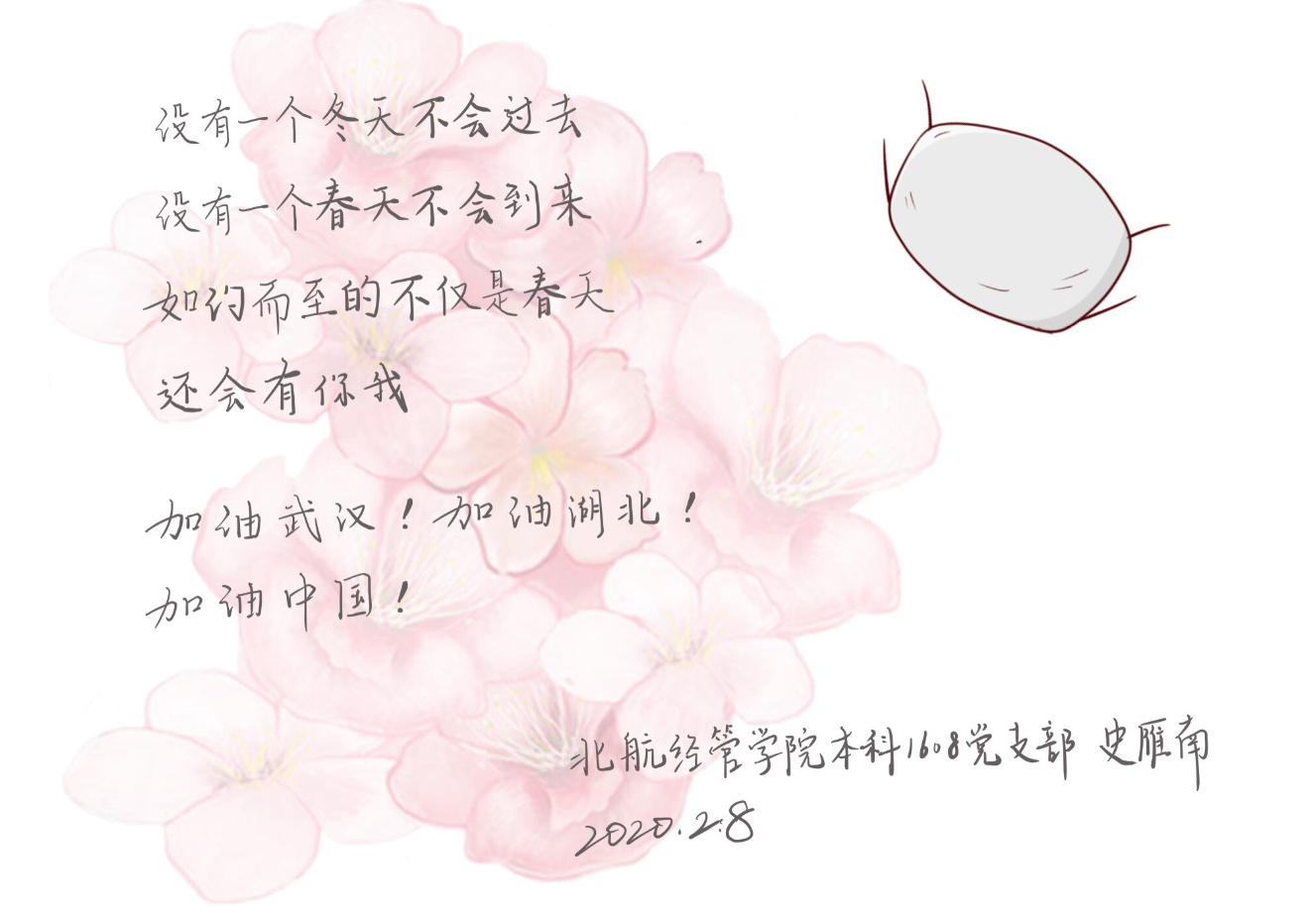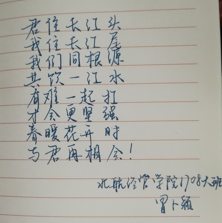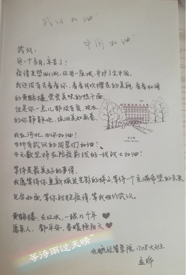学生骨干录制视频,并手书倡议书,带头号召同学们服从党中央的决策,共同战胜疫情,同时为武汉、湖北的同学加油鼓劲,送上祝福。