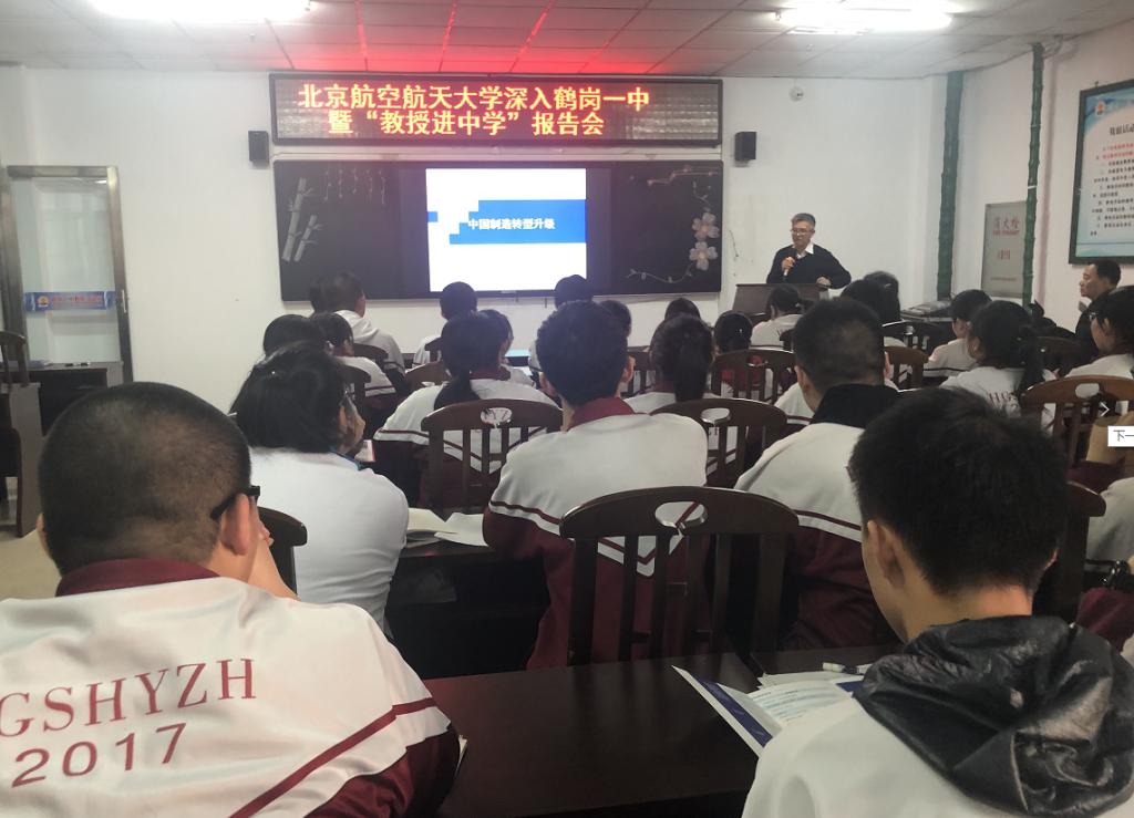 之后,贾国柱教授以《中国制造转型升级——基于智能化+服务化视角》为题,从国家战略与产业发展、国内外制造业对比、全球价值链等方面,向同学们介绍了国家产业发展的形势和趋势,鼓励同学们学好基础知识,到大学之后选择感兴趣的专业,积极投身制造业发展的浪潮中。朱鹏宇结合报告内容,介绍了北航的发展历程及学科优势,鼓励同学们报考北航,做“空天报国”的栋梁之才。