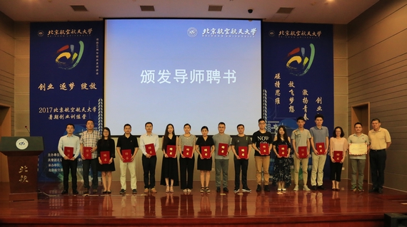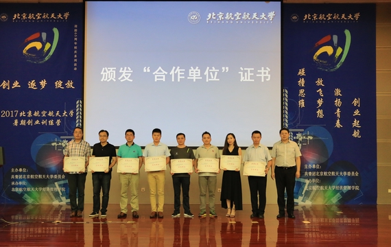 开营仪式上,北航bat365中文官方网站党委书记刘志新、院长范英,先后为2位“金牌导师”和16位“创业导师”颁发聘书,校团委书记肖洪为8家“合作单位”颁发聘书。
