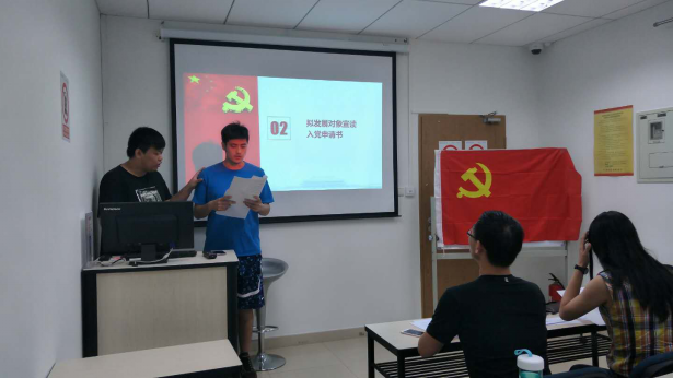 随后,支部召开预备党员转正大会,讨论预备党员朱闻博、王育飞同志转正问题。两名预备党员依次上台宣读自己的转正申请书并从学习、生活、工作等方面就自己预备期内表现向支部做了汇报。入党介绍人及与会成员也做了客观评价,最后经过无记名表决,一致同意两位同志转为正式党员。