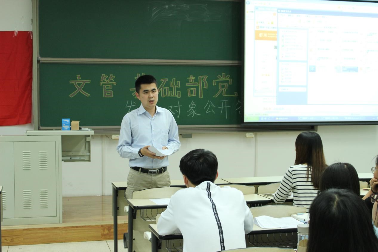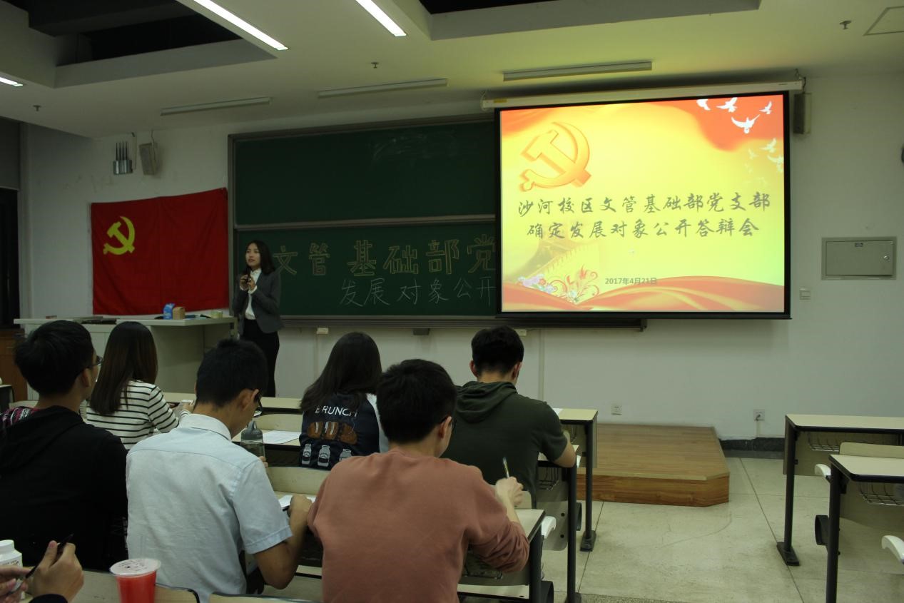 2017年4月21日晚19点30分,bat365中文官方网站沙河校区文管基础部党支部在三号教学楼103教室召开了确定发展对象公开答辩会。沙河校区党委书记陈志英老师、沙河校区党委委员肖杰老师、党支部全体党员以及所有入党积极分子参加了此次会议。会议内容主要是孙孟晗、刘璐等14位同志进行确定发展对象公开答辩。会议由党支部书记王晨同志主持。