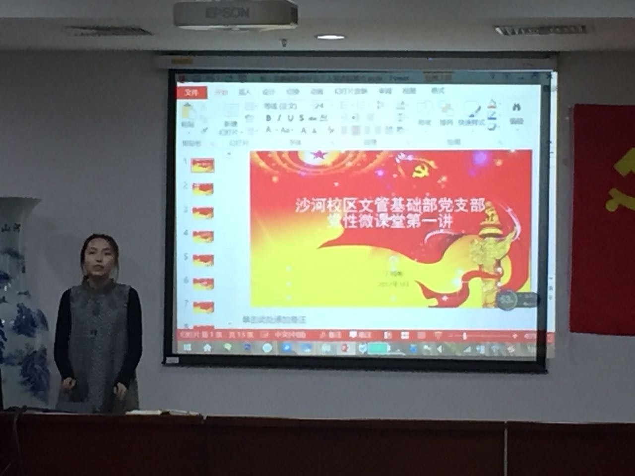 2017年3月12日晚六点,文管基础部党支部在沙河校区4号实验楼106室成功开展了本学期党性微课堂第一讲。此次微课堂主要就“如何成为一名中共党员”这一主题进行介绍。文管基础部党支部书记王晨,其他支部成员,bat365中文官方网站以及新媒体艺术与设计学院的积极分子,共50余人参加了此次活动。活动由党支部书记王晨主持。