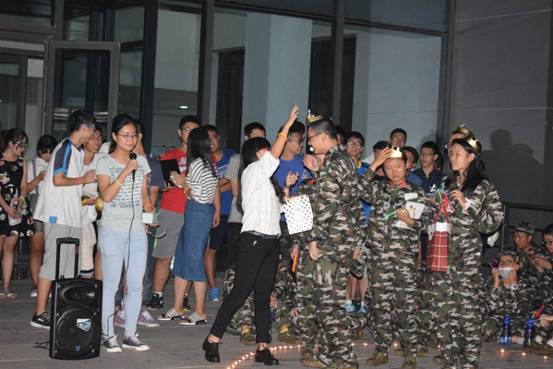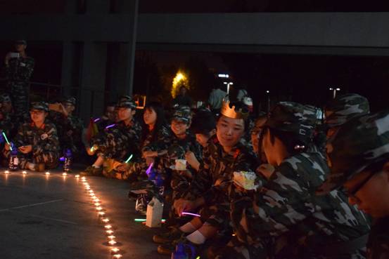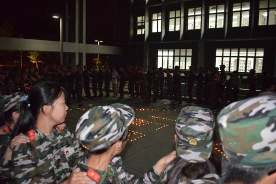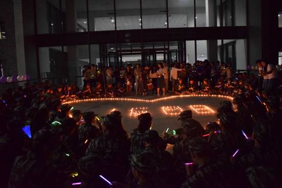 晚上八点半左右,在军训带队辅导员张羽驰和余阳杰的带领下,2016级全体新生来到一、二教学楼中间的平台处,在工作人员的引导下环坐在心形的蜡烛周围。跳动的火苗照亮了同学们的脸,在轻快音乐的烘托下,温馨愉悦的气氛充满了整个会场。