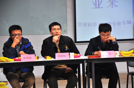 到场的嘉宾有管理科学与工程系主任邓修权老师,优秀校友梁笑辰、魏增、徐坤耀;优秀在校生崔晶以及2012级管理科学与工程专业硕士研究生。