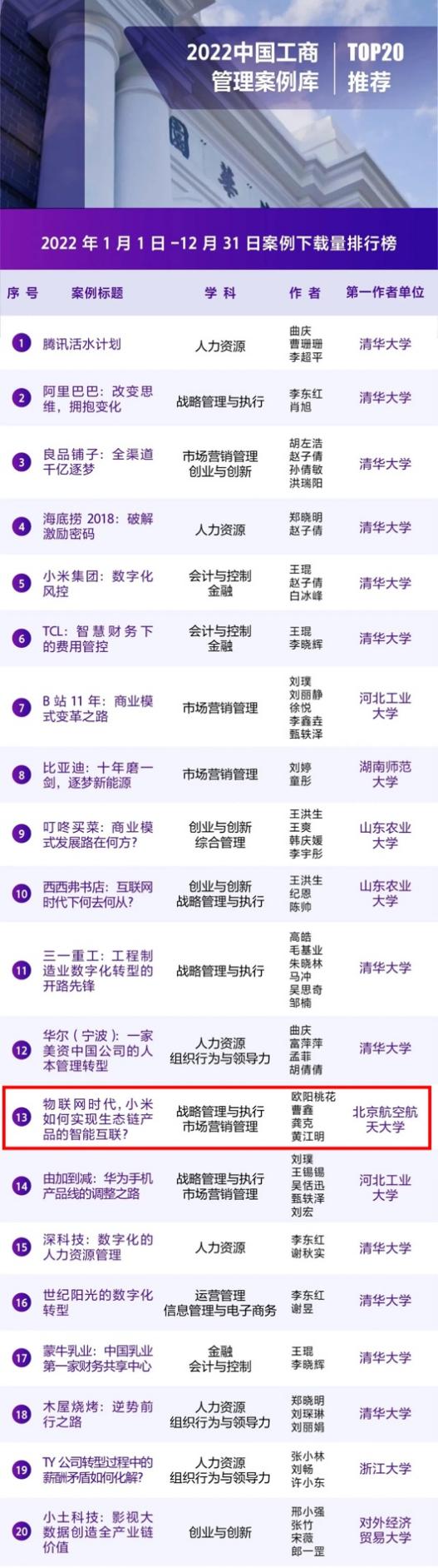 该论文发表之后,欧阳桃花教授研究团队围绕上述研究结论,延伸开发了高水平的教学案例《物联网时代,小米如何实现生态链产品的智能互联?》,围绕“构建智能互联产品体系”这一主题,从定义、难点、路径、策略和治理等方面,系统探讨智能互联产品构建模式。最终,该教学案例获得清华经管学院第四届“卓越开发者”案例大奖赛二等奖,并入选2022中国工商管理案例库TOP20榜单,位列第13位。