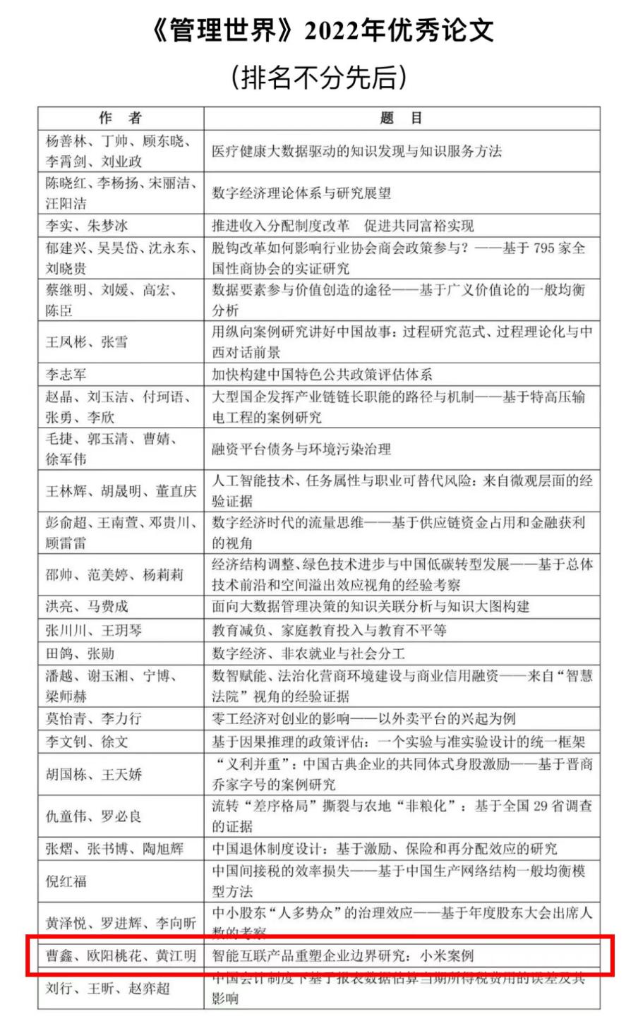 《管理世界》2022年第4期,发表了bat365官网博士生曹鑫、教授欧阳桃花等企业数字化转型的最新研究成果《智能互联产品重塑企业边界研究:小米案例》。该论文从2022年出版的12期《管理世界》共计181篇文章中脱颖而出,被评为年度优秀论文。