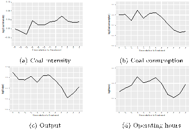 研究发现参与ETS试点后的电厂与未参与ETS的电厂相比,煤炭消费量下降了16.1%,然而两组电厂在煤炭消费强度方面的变化差异很小,双重差分模型的系数估计值为0.024。与此相呼应,ETS试点电厂的发电量相比于未参与电厂的发电量有显著下降,同时在发电利用时间方面也有一定下降,但在统计上不太显著。该研究在进一步考虑了超低排放政策,国控企业污染物自动监控,节能电力调度,燃煤电厂退出等潜在干扰因素后结果依然稳健。