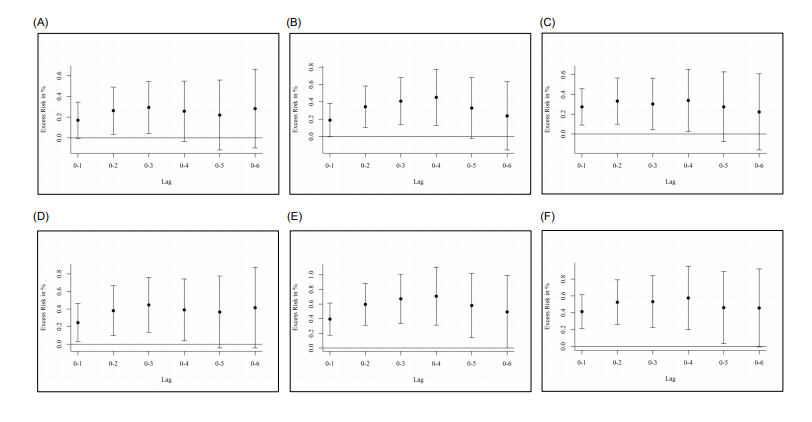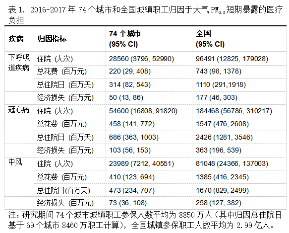 研究结果发现,PM2.5短期暴露浓度增高导致城镇参保职工心肺疾病的住院花费和住院天数均有显著增加(图2)。基于2016-2017年的74个城市城镇职工呼吸系统和心脑血管疾病住院数据,研究结果显示归因于PM2.5短期暴露(累积3天,lag0-2)的下呼吸道感染病例为28,560例、冠心病病例为54,600例,脑卒中病例为23,989例;相关的直接医疗花费分别为2.20亿元(置信区间:0.29,4.08)、4.58(1.41,7.72)亿元和4.10亿元(1.23,6.94)。以此推算全国城镇参保职工的归因损失,结果显示大气PM2.5短期暴露造成的额外住院人次为362,007人次,相关额外直接医疗花费将达36.8亿元(表1)。