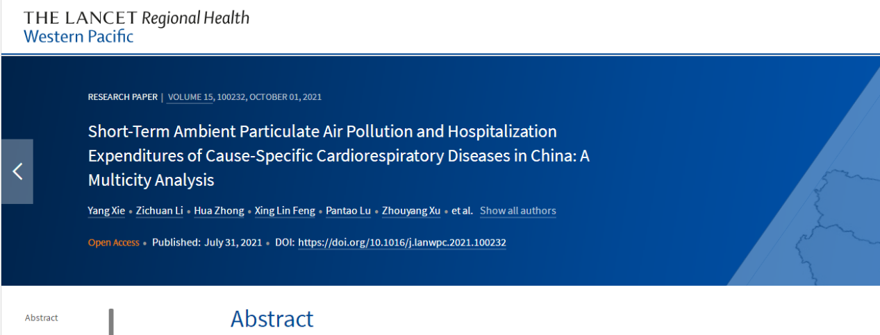 近日,北航bat365中文官方网站谢杨副教授课题组和西安交通大学吴少伟教授课题组合作,对我国部分城市人群短期暴露于大气颗粒物污染导致的额外住院人次和经济负担进行了详细分析,并在《Lancet Regional Health-Western Pacific》杂志发表了题为“Short-Term Ambient Particulate Air Pollution and Hospitalization Expenditures of Cause-Specific Cardiorespiratory Diseases in China: A Multicity Analysis”的论文(https://www.thelancet.com/journals/lanwpc/article/PIIS2666-6065(21)00141-3/fulltext)。