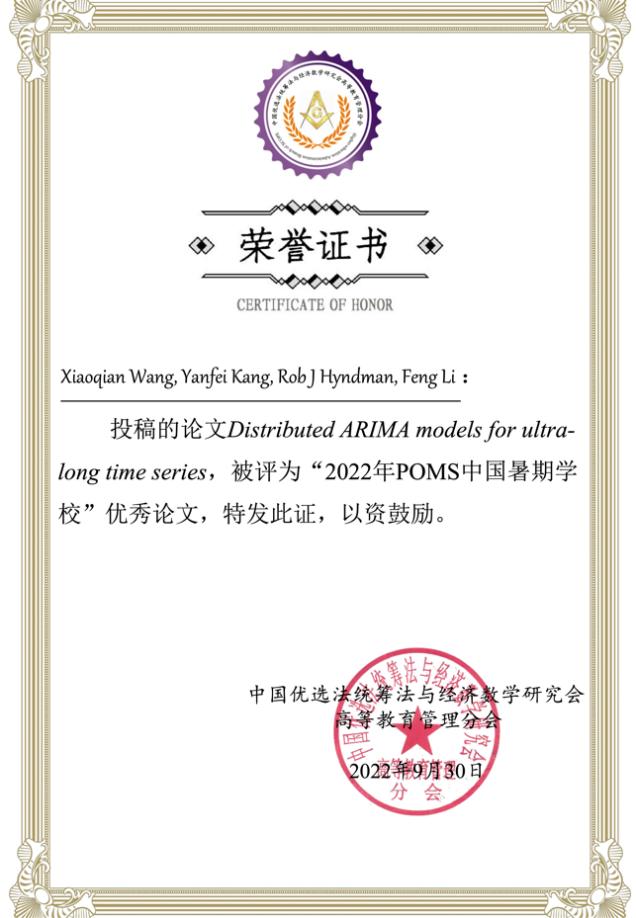在优秀论文评选环节,bat365官网卓越百人博士后张源凯和2018级博士生王晓倩分别分享了精彩的学术论文报告,张源凯的论文Pull your packages: Integration of assembly planning and stochastic operations for multi-item order fulfillmen和王晓倩的论文Distributed ARIMA models for ultra-long time series荣获2022年POMS中国暑期学校优秀论文奖。