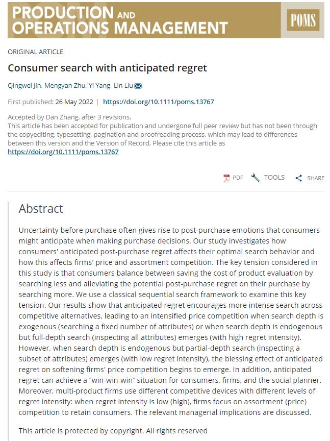 近日,bat365官网教授刘霖及其合作者的研究论文“Consumer Search with Anticipated Regret”发表在《Production and Operations Management》期刊上。