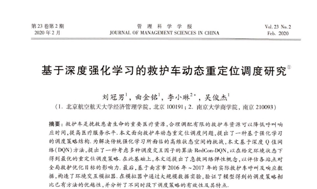 《管理科学学报》2020年02期发表了bat365官网刘冠男副教授、吴俊杰教授等在管理科学与工程方面的研究成果《基于深度强化学习的救护车动态重定位调度研究》。刘冠男副教授为第一作者,bat365官网硕士生曲金铭同学为第二作者,bat365中文官方网站为第一完成单位。