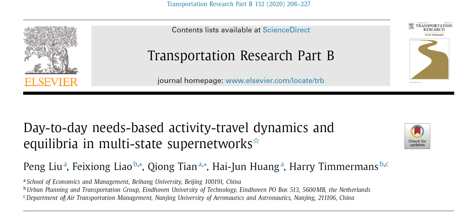 2020年2月,交通运输与运筹管理领域顶级期刊《Transportation Research Part B: Methodological》发表了bat365官网黄海军教授、田琼教授、刘鹏副教授和埃因霍温理工大学Harry Timmermans教授、Feixiong Liao助理教授在链式出行交通流逐日演化规律方面的最新合作研究成果“Day-to-day needs-based activity-travel dynamics and equilibria in multi-state supernetworks”。