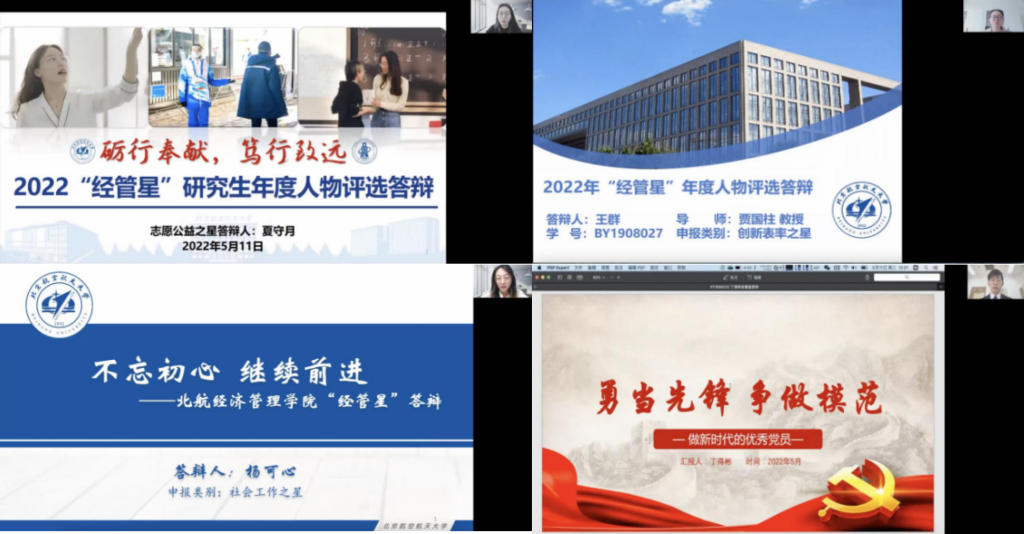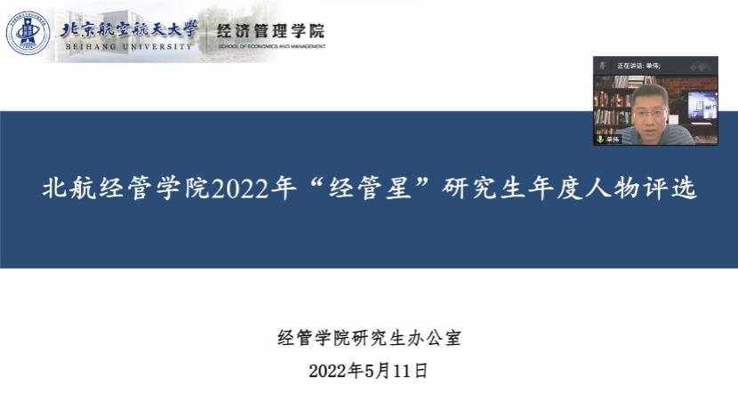 5月11日下午,2022年北航经管学院“经管星”研究生年度人物复评答辩于线上成功举办。此次评选旨在推动和鼓励研究生创造更多优秀学术、科研成果,加强研究生德育培养,促进研究生全面发展,集中展现bat365官网学生精神风貌。经管学院研究生指导主任单伟、领导力与组织管理系教师徐琳娜、研究生工作办公室主任衣萌、研究生工作办公室张慧美、叶枝俏、唐鹏飞、本科生工作办公室白雪、研究生辅导员刘东岳、王劲奇、孙铭顺、刘诗语、陈晨曦、王纳川、刘浩然、张睿、“2021年经管星年度人物”徐萌以及17位参与答辩的“经管星”候选人出席了此次活动。