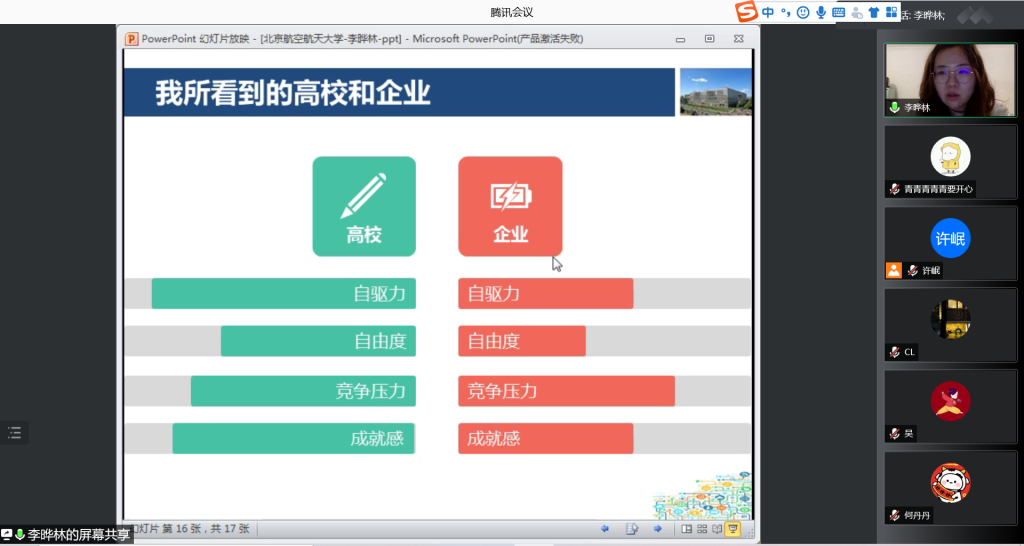 李晔林详细介绍了自己的求职历程,为大家解读了业界求职和招聘的流程,无私分享了宝贵的求职经验和有用的信息。她还就企业招聘与高校的区别、业界和高校选择的考虑进行了分享,最后为同学们提出了中肯的建议。