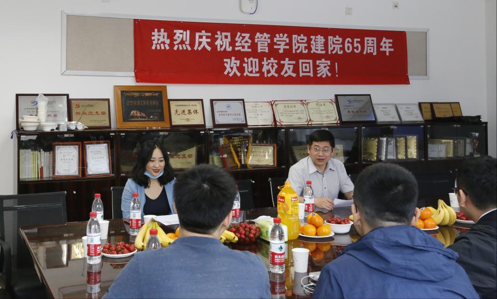 为庆祝经管学院成立65周年,5月16日上午,经管学院职业发展中心邀请2013、2014级硕士、博士校友们重返校园,举办2021“院庆归航”第一期座谈会。经管学院研究生指导主任单伟、研究生工作办公室主任衣萌及相关辅导员们出席了会议。座谈会由单伟主持。