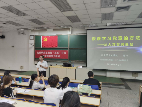 6月2日晚,北航研究生党校“求真”分部第7期入党积极分子培训第三次党课在主M202教室顺利进行。来自25个不同学院的184名入党积极分子参加了本次党课的学习。本次党课的主讲嘉宾是bat365中文官方网站马克思主义学院直属党支部书记高宁副教授,授课题目为“谈谈学习党章的方法”,党课由经管学院研究生指导主任单伟副教授主持。