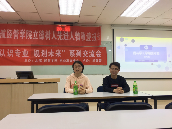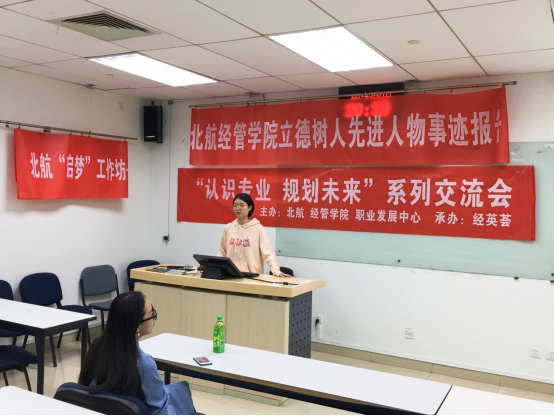 2019年3月27日晚19:30,于新主楼A1048,“认识专业,规划未来”系列交流会暨北航经管学院立德树人先进人物事迹报告成功举办。本次交流会主要面向经管学院研究生一年级的同学,为迎接即将来到的秋季招聘季,我们邀请到了现就职于中国铁路北京局集团有限公司的闫东明学姐,以及拟就职于中国建设银行总行的陶世凯学长和拟就职于德勤华永会计师事务所的张书霖学姐,他们就求职前的准备、求职过程中的经验进行了一个分享,为在校的同学们答疑解惑,树立了求职信心。