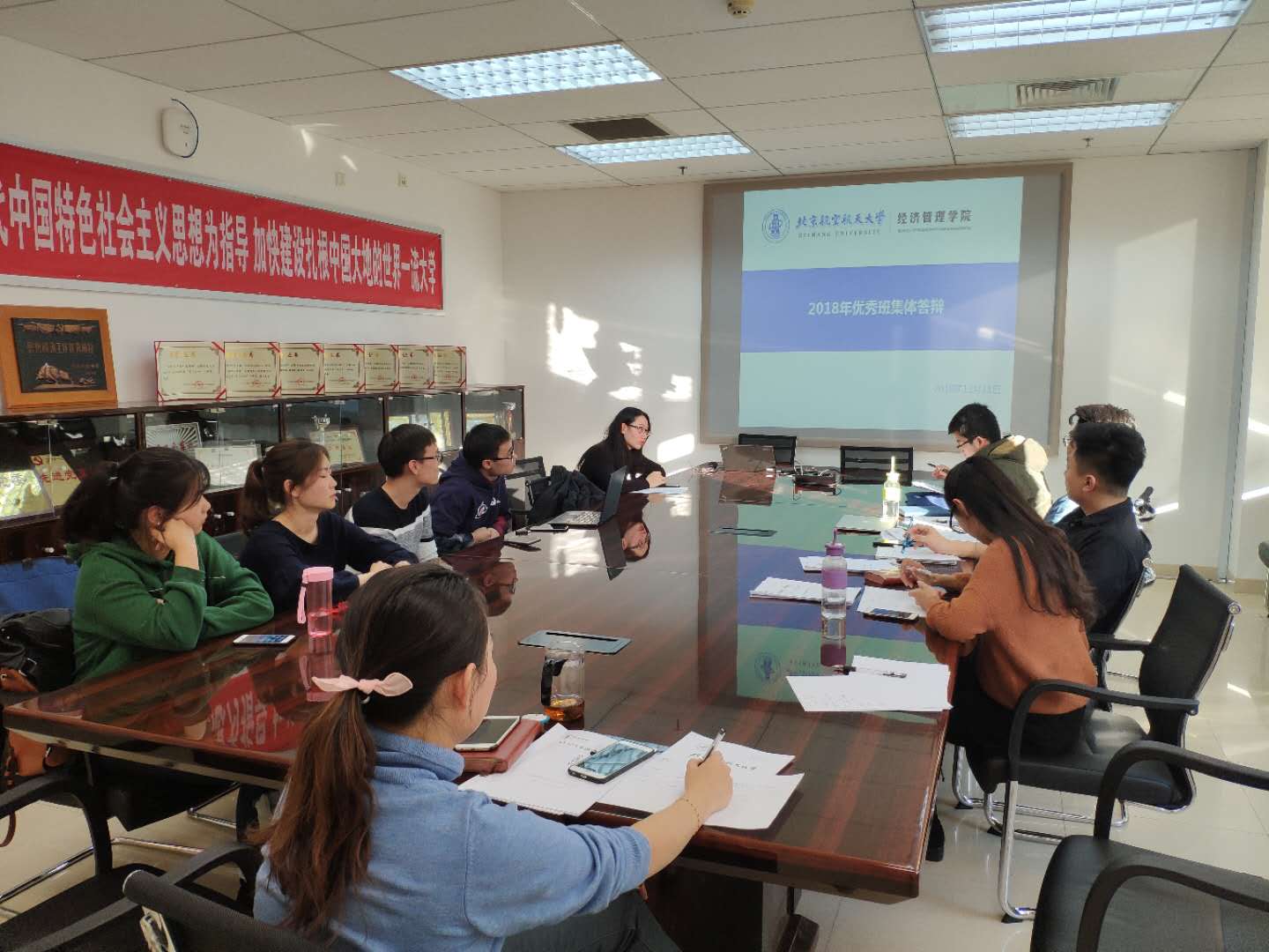 为贯彻党的教育方针,促进校风、学风建设,增强广大研究生班级文化氛围和凝聚力, 12月11日,北航经管学院2018年度优秀班集体答辩在新主楼A710举行。经管学院研究生办公室主任衣萌老师,研究生辅导员唐鹏飞、侯树森、李斯然、吴燕霞、张书霖担任评委。