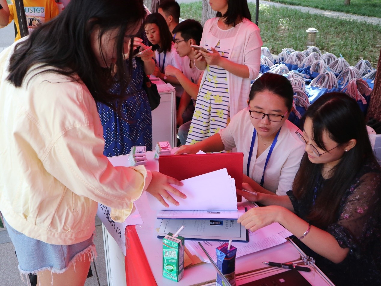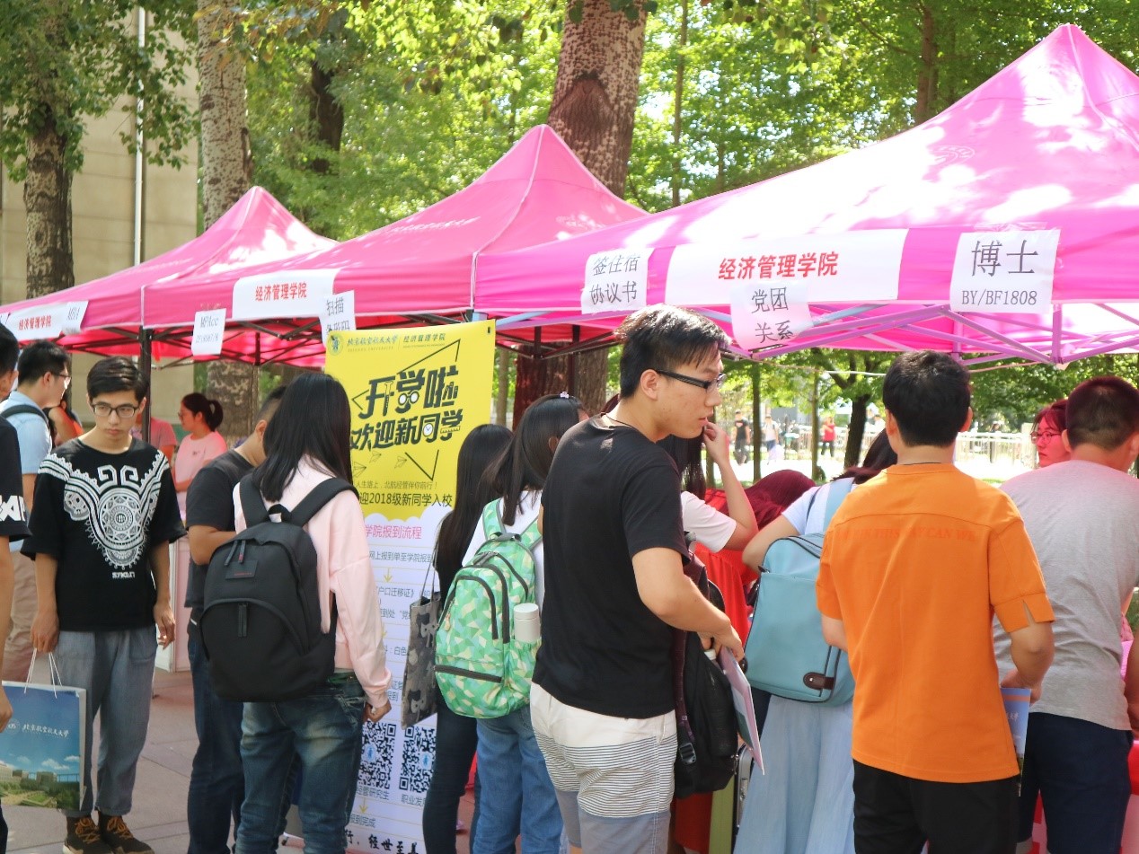 烈烈暖阳,新生报道程序也顺利步入正轨,扫描网上报道条形码、转党团关系、收取材料、发放材料,负责迎新的志愿者们分工明确,工作有条不紊,整个迎新快捷、高效。志愿者同学的真诚服务与现场迎新老师们耐心的解答,让新生们一开始就感受到北航经管人的亲切与热情。