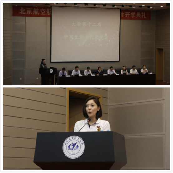 颁奖环节结束后,由新生代表进行发言。MBA新生代表赵洢瑶同学发言,她认为工作后重新回到学习中,使她感到充满了仪式感,不忘初心,坚守梦想,要敢于去追求卓越。研究生新生代表毕艺苇同学认为学习是基础,工作是实践,在接下来的时间中,要努力学习,做一个知行合一的北航人,要戒骄戒躁,仰望星空,脚踏实地。在校研究生代表夏棒同学代表全体研究生对2017届学弟学妹表示热烈欢迎,希望新生可以和北航一起成长,要明白自己喜欢什么,不能随波逐流,不甘于平庸,认认真真做事,踏踏实实做人,必不会被生活辜负。