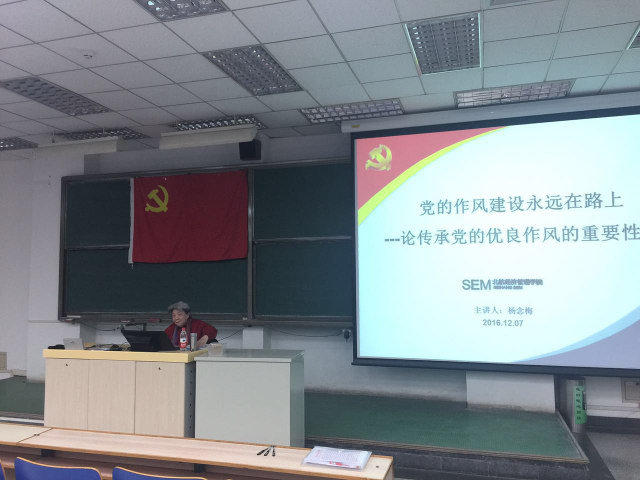 2016年12月7日,在主M楼101,“求真”分部第2期入党积极分子培训进行了第三次党课。本次党课的主讲人是老党员杨念梅老师。主题为党的作风建设永远在路上——论传承党的优良作风的重要性。课前经管学院研究生办公室主任衣萌老师对入党积极分子的第四次培训做了初步介绍和部署。