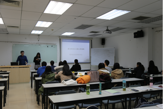 首先,由班长苏道启进行有关社会主义核心价值观的演讲,向全班同学讲述了社会主义核心价值观的内容和意义。