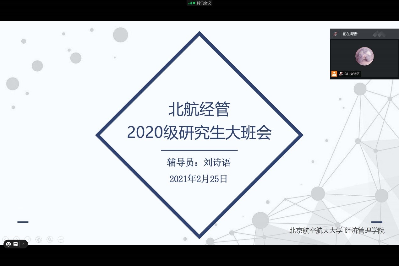 2021年2月25日下午,2020级硕士研究生新学期首日教育大班会在腾讯会议平台顺利举办。本次会议由2020级硕士研究生辅导员刘诗语主持召开。