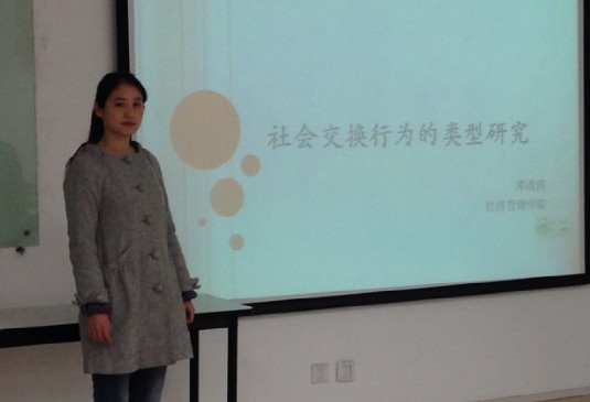 宣讲会的第一位宣讲人是企管专业的邓清清,她的论文题目是《社会交换行为的类型研究》,文章区别于前人以报酬为导向的研究,提出从人的社会行为本身出发来研究社会交换行为,通过总结和完善前人的量表,设计出适应中国情境的问卷,通过对某高校的571位本科生及研究生的问卷调查,运用高阶验证性因子分析,得到社会交换行为的三种类型:利他型、利己型、合作型。第二位宣讲人是交通管理专业的罗婷,她的论文题目是《考虑延误时间成本下的航空公司竞争》,文章通过对双寡头市场的竞争分析拓展到对n家航空公司的分析,并最终建模得到各种可能因素对航空公司运营成本的影响,这对于实际运用十分参考价值。最后是由薛娜带来一篇题为《Combining Social Collaboration for Scientific Knowledge Base Construction under Web 2.0》的英文论文报告,文章提出了一个新颖的方法即基于领域本体的知识库建设,将在线合作方式与领域本体建设相结合,最终,这项研究提供了一个协作的方式来构建领域本体的基础,这对于要求集体智慧和专业智慧的组织在解决问题和做决策方面有深远意义。