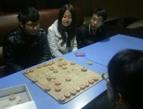 11月23日18:00,全班同学在北航南门集合,虽然天气不好,寒风萧瑟,然而同学们的热情却并未因此而减弱,大家有说有笑的向棋牌室奔去。比赛在6点20左右正式开始,参赛选手分为8组进行,并由5人负责比赛秩序,每组中的胜利者再通过抽签选择对手,进入下一轮比赛,采取一局定胜负,最后进入决赛的2名选手通过三局两胜制决出冠亚军,分别授予奖品。几个小组同时开战,棋牌室一下子热闹起来了,观众们也都慷慨激昂,跃跃欲试,经过几番厮杀冷门迭出,使得冠军花落谁家一直充满悬念。