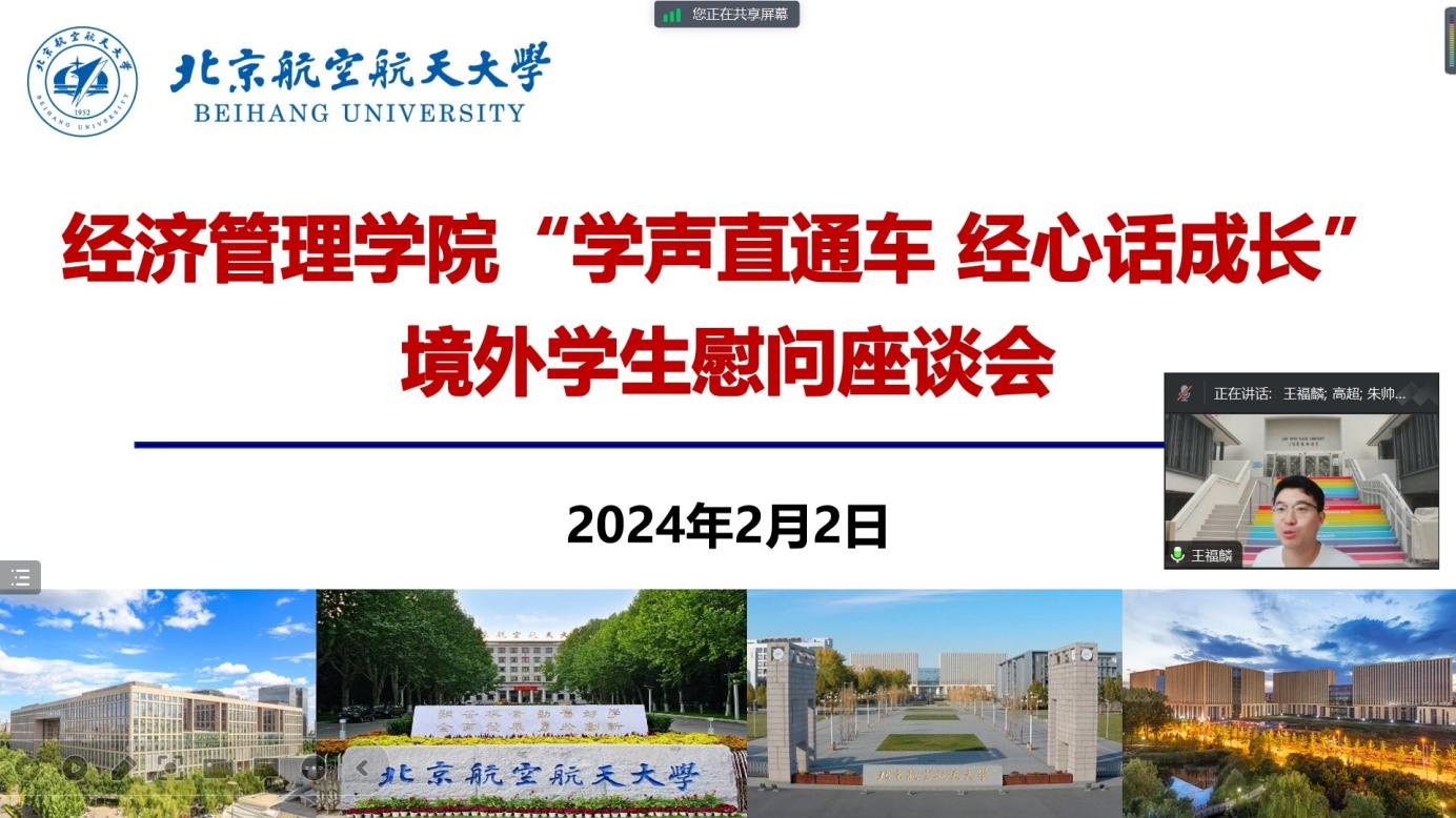 高超老师首先传达了学院对境外同学的关心和慰问,选择在小年这一天组织本次座谈,也是希望能够给每位同学带去祖国家乡新春的祝福。会上,各位同学分别介绍了自身所在国家和学校的学习、科研和生活的相关情况,高超老师与每一位同学都进行了沟通和交流。高超老师对境外同学有三点叮嘱,一是在境外务必注意人身财产安全,如遇任何困难及问题,一定要第一时间联系学院,学院会给予最大程度的关心和帮助。二是在国外过年,希望大家能够多与家人导师视频联络,让家人放心。如有学术上的困难,多与导师沟通,注意自身学业进度,不要错过开题、毕业等重要时间节点。三是希望同学们能够充分利用访学学校的资源,与校方建立更深层的联系,挖掘国际化交流资源,助力学院学校的国际化发展。
