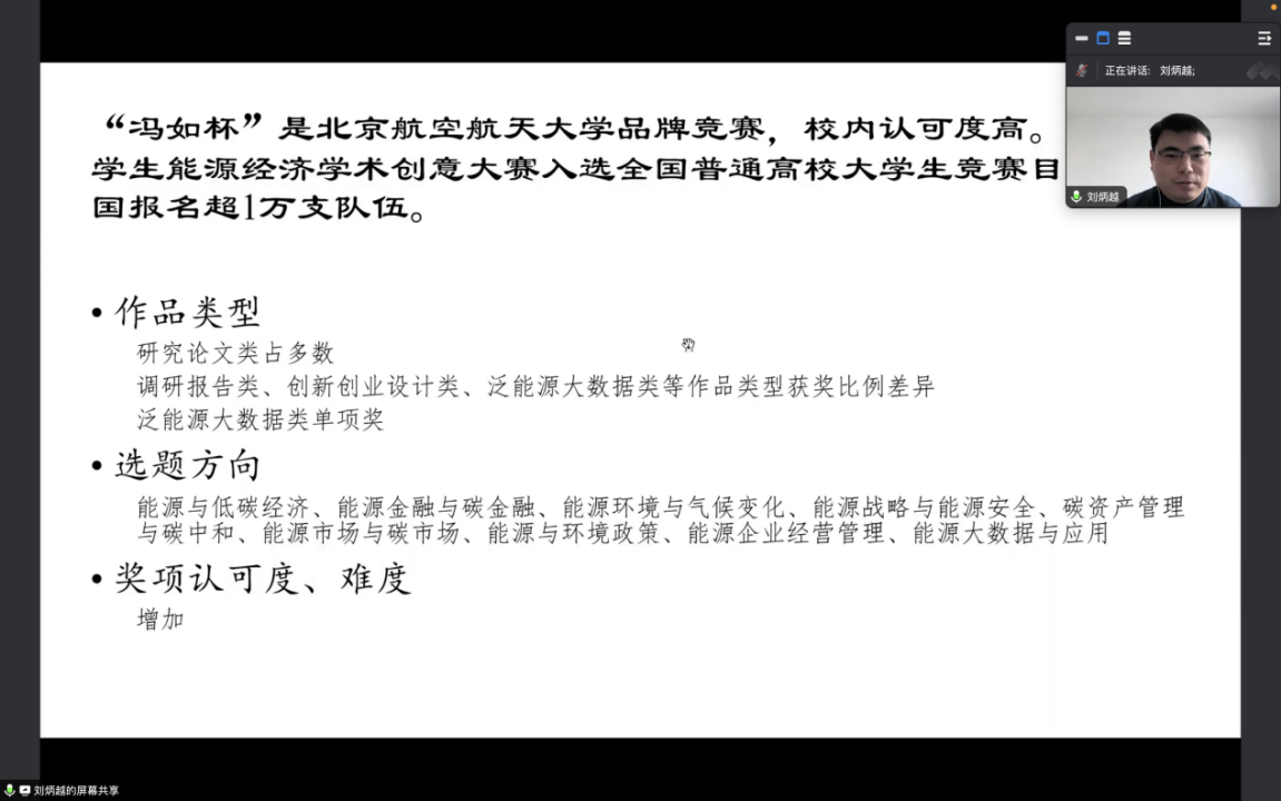 之后,姚星老师从自己的经验出发,给予学生参赛建议,姚老师强调能源经济大赛作为一个创新创意大赛,学生的选题要做到结合专业知识,在能源经济领域挑选贴合国之所需、民之所求的内容,同时在竞赛中不断夯实自身的专业知识,提升创新能力。