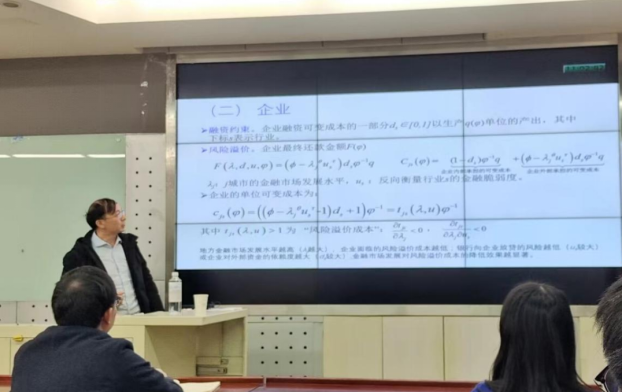 紧接着,刘啟仁教授介绍了文章的7个理论模型,从消费者、企业、自由进入均衡、金融市场发展与消费者福利四个方面展开,详尽说明了消费者效用最大化、企业融资约束和风险溢价成本、企业供给、企业存活门槛、市场供给平衡、自由进入均衡以及消费者福利等具体模型,并根据理论模型提出5个命题。