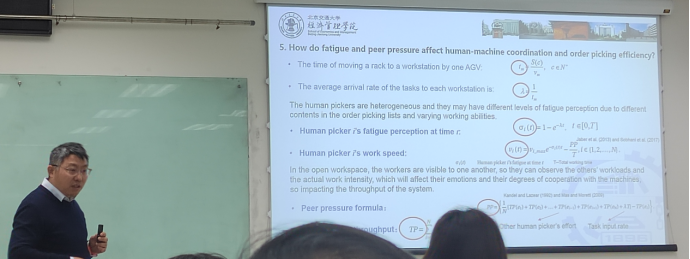 华教授首先向我们介绍了人工智能对生产和物流行业的影响,基于人工智能的混合人机订单拣选系统广泛应用于电子商务仓库(例如亚马逊和京东集团),其中人工拣选员和自动化机器协同工作。相比于机器能长时间且稳定的进行工作,人工拣选员则会受到疲劳、同伴压力等人为因素的影响,这些因素如何影响拣选员的订单拣选效率和系统的吞吐量,如何衡量拣选员的工作满意度以及机器如何进行进行任务分配等仍尚缺乏研究。