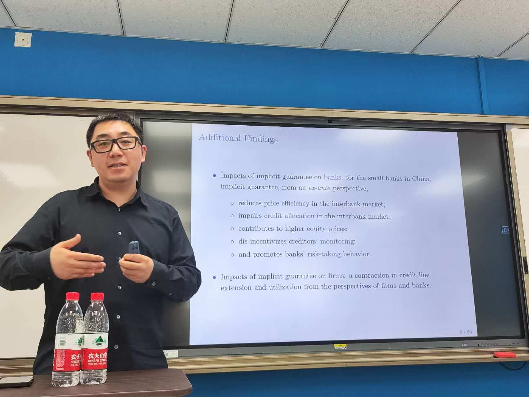 本期融实论坛,周臻教授做题为“Let a Small Bank Fail: Implicit Non-guarantee and Financial Contagion”的学术报告。他以包商银行破产处置事件为背景,引出我国监管部门首次打破常规,未对中小银行进行完全救助和担保。这一举措偏离了市场长期的刚性兑付预期。基于双重差分法的研究发现,包商银行事件后,在同业存单市场呈现出显著变化。相比于系统重要性银行,非系统重要性银行(中小银行)的融资成本(信用利差)大幅增加,同时融资比率明显下降。这种融资困难不仅显著,而且具有持久性,甚至导致部分中小银行陷入融资困境。从事件发展的角度分析,包商银行事件引发了一系列连锁反应。它导致了风险传染,对金融系统稳定产生了一定程度的影响。实证分析确定了一种以对银行救助信心下降为标志的新型传染机制,这一机制解释了其他几家小型银行随后的倒闭情况。但从事前角度分析,消除市场隐形担保预期具有积极作用,有助于提高定价效率、改善信贷分配。并且,相比于系统重要性银行,非系统重要性银行出现股票价格下跌、债权人监督意愿提高以及风险承担降低等现象,抑制了小型银行的冒险行为。