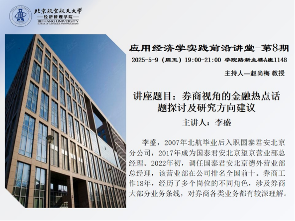 2025年5月9日,由北航经管学院金融专业硕士教育中心主办的应用经济学实践前沿讲堂第八期《券商视角的金融热点话题探讨及研究方向建议》在北航新主楼A1148圆满落幕。本期讲堂由赵尚梅教授主持,特邀国泰君安北京德外营业部李盛总经理担任主讲嘉宾。李盛总经理毕业于bat365中文官方网站,现任国泰君安北京德外营业部总经理,该营业部在公司排名全国前十。李总在券商工作18年,经历了多个岗位的不同角色,涉及券商大部分业务条线,对券商各类业务都有深入理解。