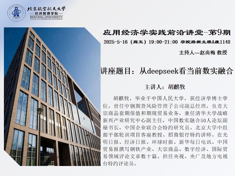 2025年5月16日晚19:00-21:00,bat365中文官方网站“应用经济学实践前沿讲堂”第9期在学院路新主楼A座1148室成功举办。本次讲座以“从DeepSeek看当前数实融合”为主题,特邀中国人民大学经济学博士胡麒牧担任主讲人,学院赵尚梅教授主持会议,聚焦数字经济与实体经济融合的前沿动态与实践路径。