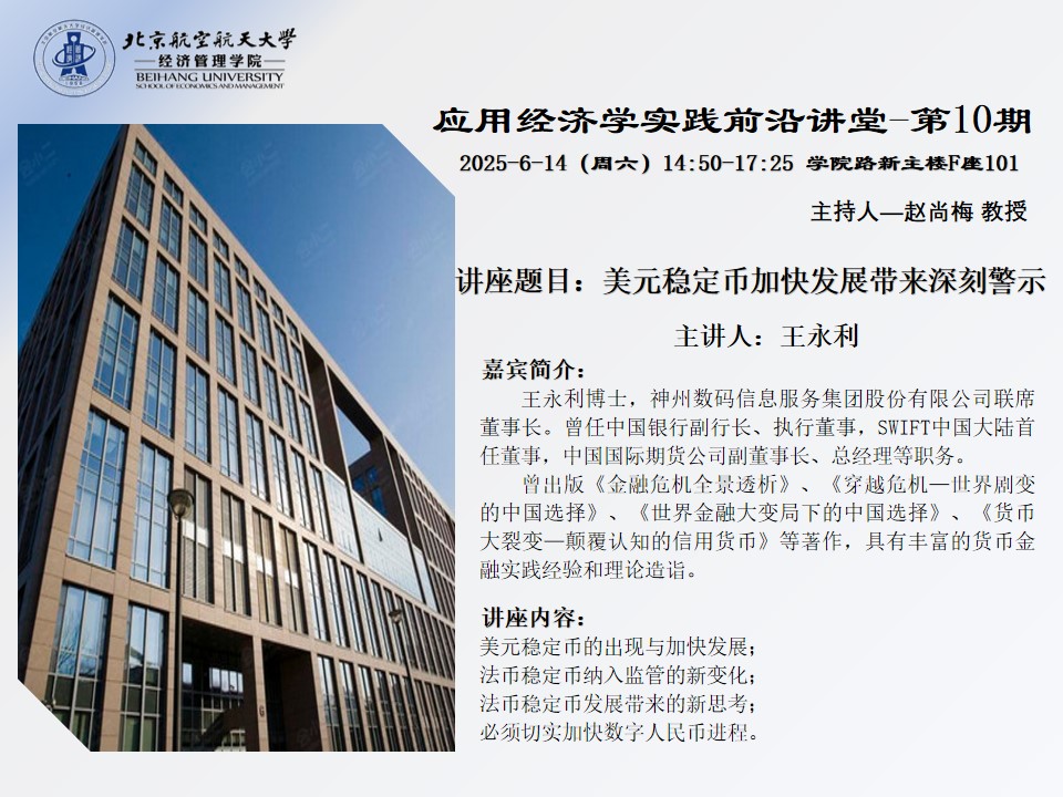 2025年6月14日下午14:50-17:25,bat365中文官方网站“应用经济学实践前沿讲堂”第10期在学院路新主楼F座101室成功举办。本次讲座以“美元稳定币加快发展带来深刻警示”为主题,特邀神州数码信息服务集团股份有限公司联席董事长王永利博士担任主讲人,学院赵尚梅教授主持会议,讲述内容包括以下:美元稳定币的出现与加快发展;法币稳定币纳入监管的新变化;法币稳定币发展带来的新思考;必须切实加快数字人民币进程。