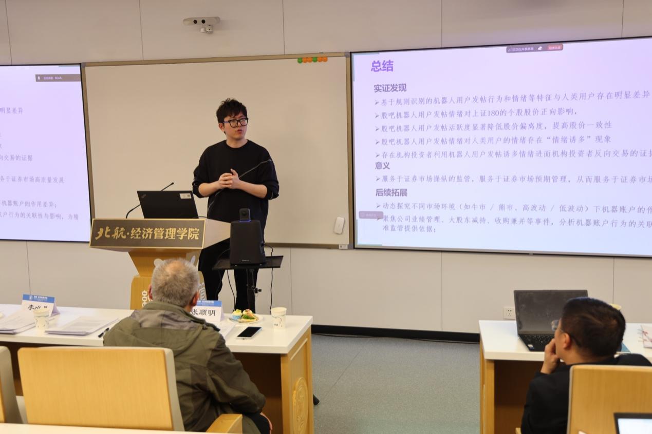 第四篇论文《谁在塑造市场情绪?人类账户 vs. 机器人账户》由上海交通大学、上海商学院顾晨副教授汇报,该论文为其与多位学者合作完成。谭小芬教授、侯恪惟教授、张顺明教授、石丽娜博士担任点评人,论文作者之一郜慧副教授参与学术交流讨论。