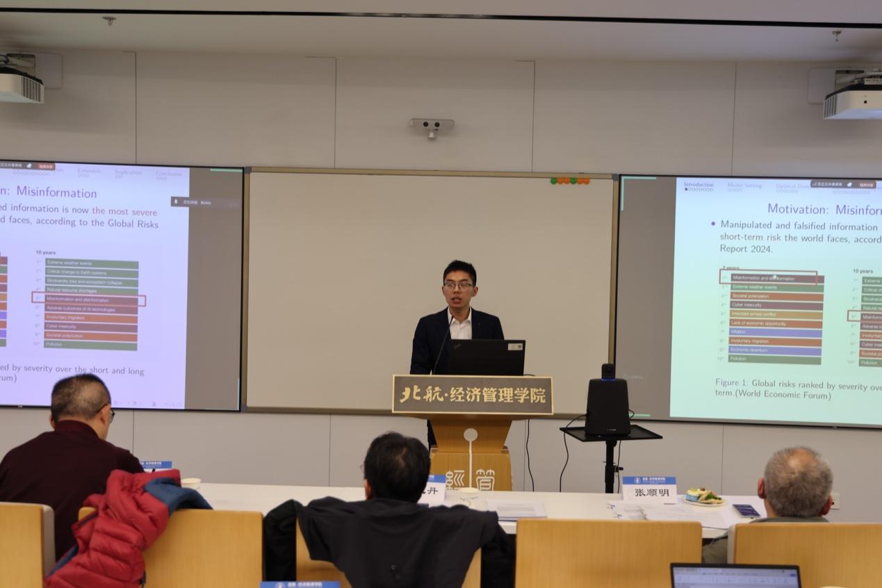 第二篇论文《Too Good to Be True: Misinformation and Ambiguity Aversion》由北航经管学院王论意博士汇报,杨立岩教授、李心丹教授担任点评人。论文作者之一张顺明教授参与现场讨论交流,就研究相关问题深入探讨。