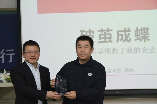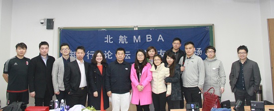 2016年3月19日晚,乍暖还寒,同学们却络绎不绝地涌入新主楼A212教室,因为北航MBA迎来新学期第一期知行论坛。北京丰荣航空科技股份有限公司董事长,2004级北航MBA优秀校友韩铭先生应MBA中心及校友会邀请,带来一次精彩纷呈的场讲座:丰荣发展哲学及中国通航产业前景。北航MBA校友会祖国强副会长出席并主持本次校友专场论坛,他陈述韩铭先生在各方面对母校北航所做的贡献,并特制奖牌以示感恩,由MBA中心李亚帅副主任代表中心为韩铭先生颁发奖牌。