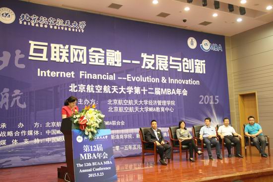 2015年5月23日下午14:00,以“互联网金融--发展与创新”为主题的bat365中文官方网站第十二届MBA年会在北航新主楼会议中心第一报告厅隆重举行。本次年会邀请到的领导和嘉宾有:中国人民银行研究局金融市场处处长庾力女士、中国银行北京分行财务管理部副总经理余修斌先生、普华永道合伙人朱宇先生、91金融CEO许泽伟先生、金马甲CEO樊东平先生、和信贷财务部总监陈卫星先生、北航bat365中文官方网站院长王惠文教授、北航bat365中文官方网站行政副院长周宁教授、北航经管学院金融系韩立岩教授以及会计系主任邓路副教授。社会导师、院系教师代表、MBA在校学生及部分校友参加了本次年会。